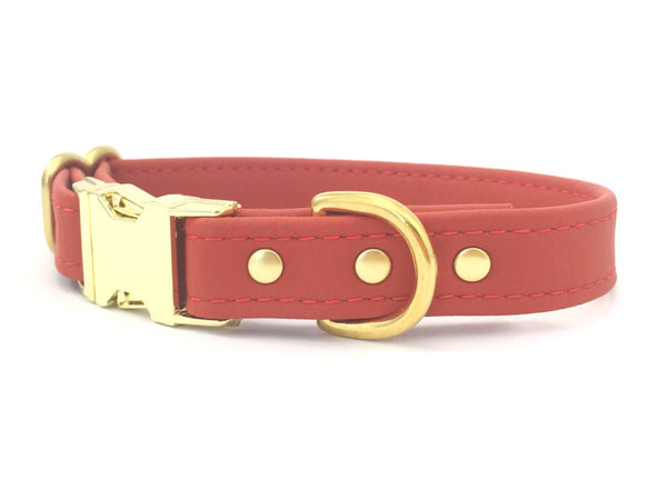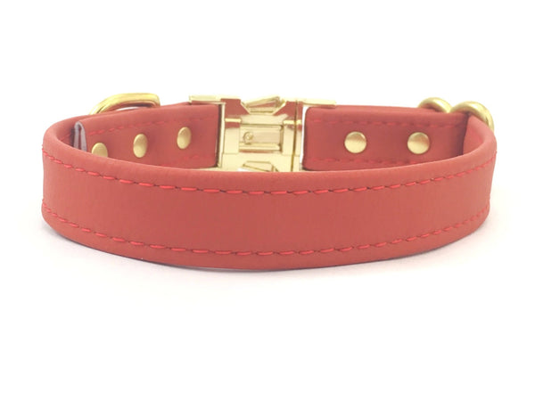 Red vegan silicone leather dog collar with luxury brass buckle.