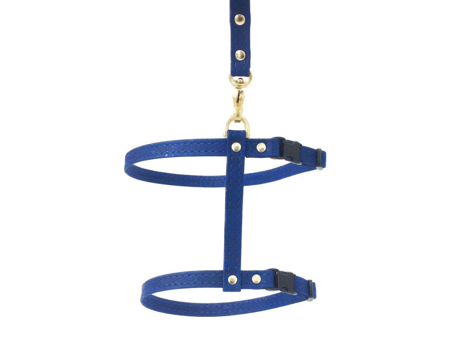 Blue cat harness and lead set in vegan cork leather and luxury brass. Made in the UK.