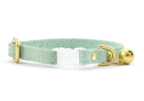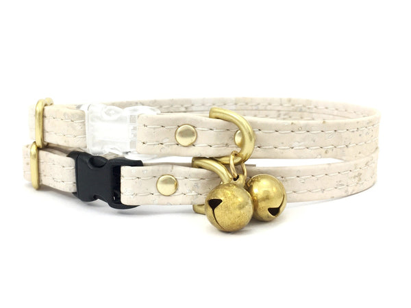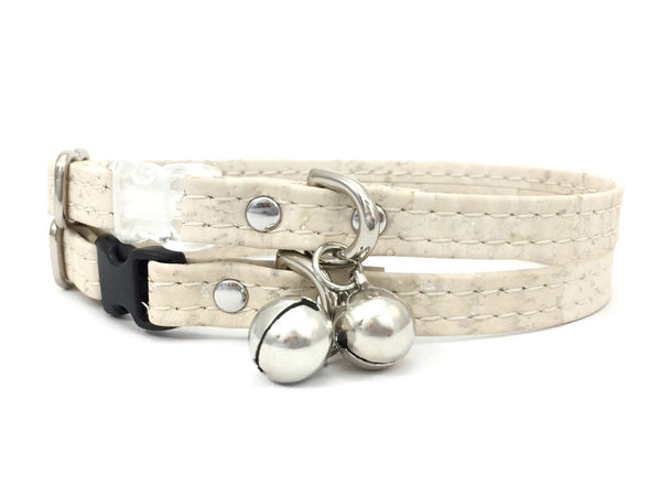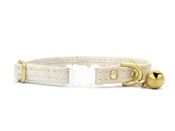 White Vegan Cork Leather Breakaway Safety Cat Collar With Bell - Brass & Silver