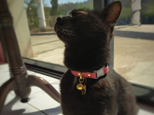Available with a choice of transparent or black plastic breakaway safety buckle and a choice of solid brass or black plastic slider. If you would prefer your cat collar without a bell, please let us know in the order comments.