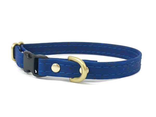 Blue vegan cork leather miniature dog and puppy collar with lightweight buckle and luxury brass hardware.