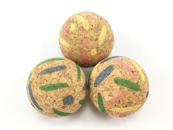 Our natural cork cat ball toys in a fun stripes and spots design are made from eco friendly vegan cork bark. Most kitties will enjoy batting and chasing these stylish balls around - perfect for cats who like to play ball!