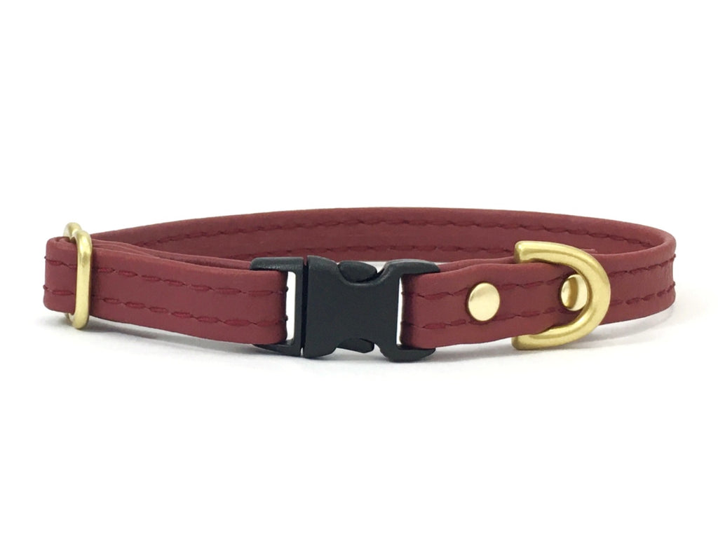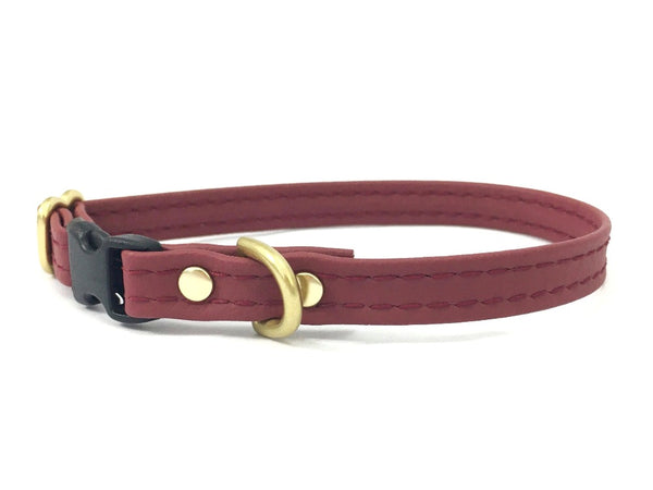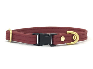 Our burgundy miniature dog and puppy collar is made with ethical vegan silicone leather and features luxury solid brass hardware and a lightweight quick release buckle.