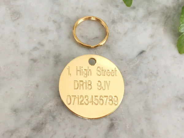 The small round cat tags are 22mm and can be personalised with one line of text on the front, which will be engraved above the star and up to four lines of text engraved on the back.