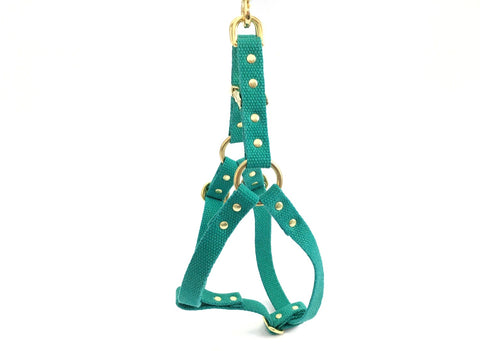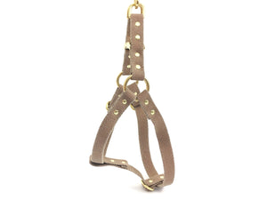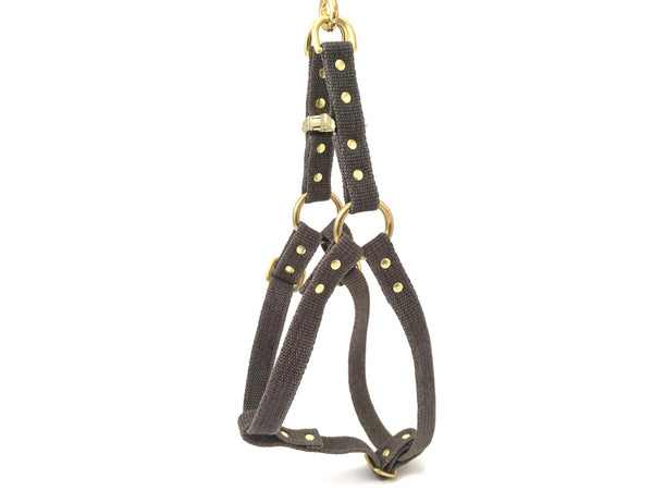 Step-in dog and puppy harness in natural grey cotton and luxury solid brass. Fully adjustable and made in the UK.