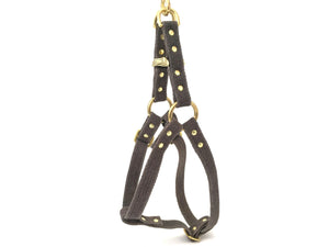 Dog and puppy harness in grey cotton and luxury solid brass. Available for tiny dogs such as Chihuahuas and large dogs like Labradors. Made in the UK.